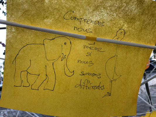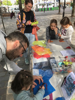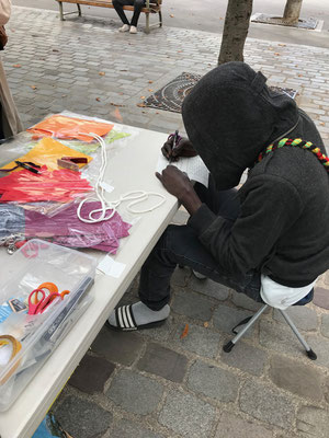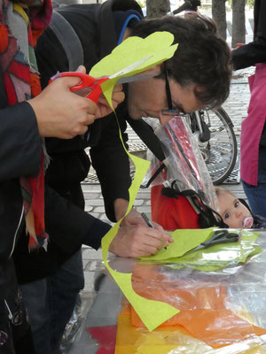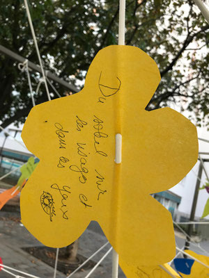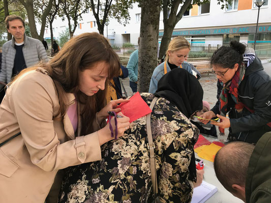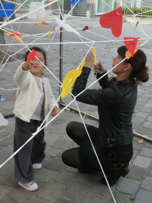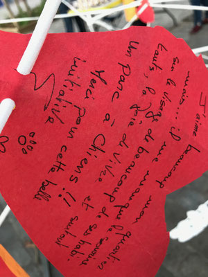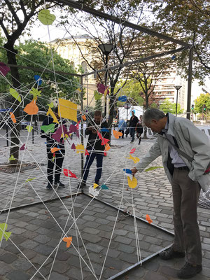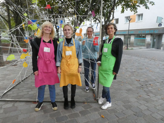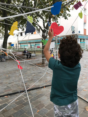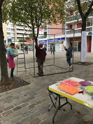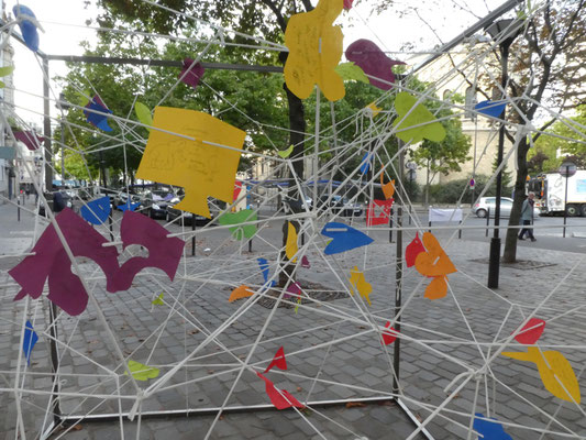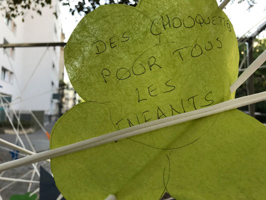 Remerciements à Céline Pattin de l'équipe de développement local du quartier, à la Mairie de Paris, principal partenaire, à Camille, Jezabel, Véronique et Marie pour l'animation de l'action, aux créatrices et créateurs de passage qui ont tendu des fils pleins de souhaits, de bonne humeur et de poésie, à Véronique et Clotilde pour les prises de vue.