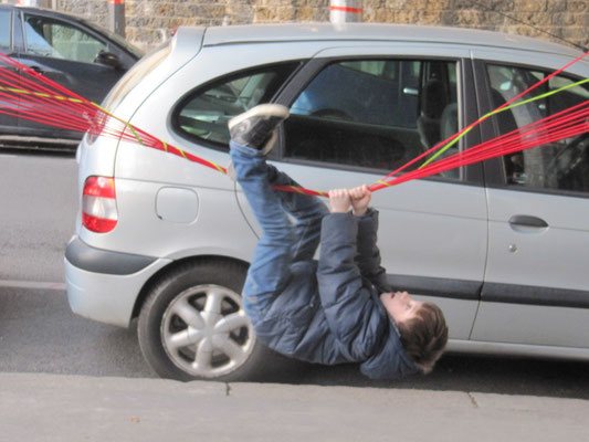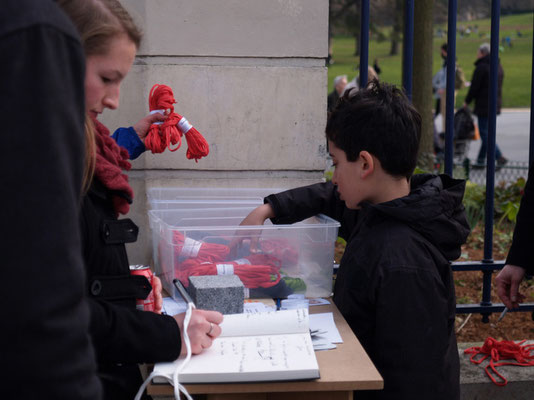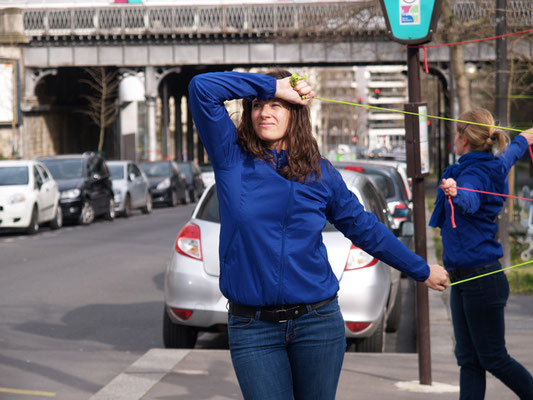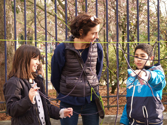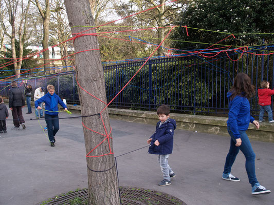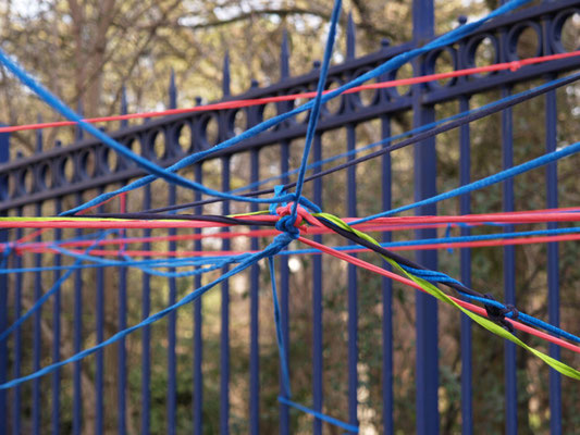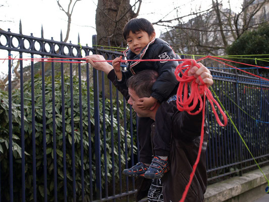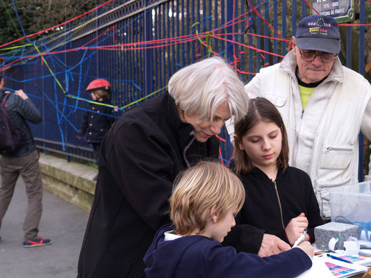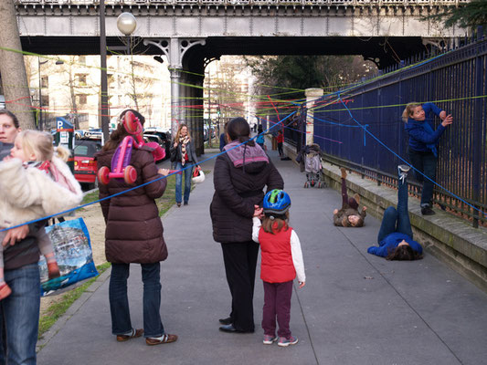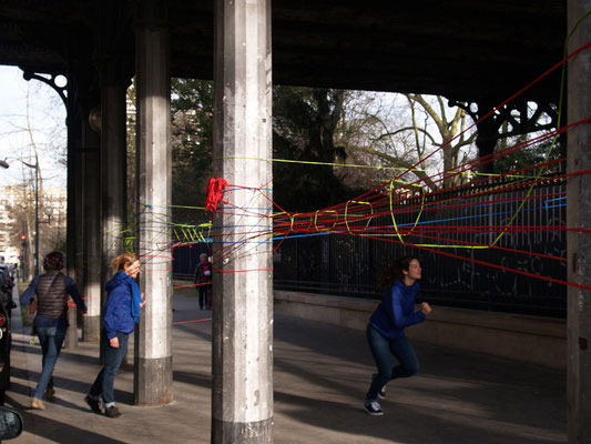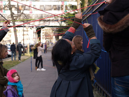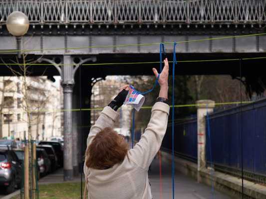 Invitée pour réaliser une œuvre participative, l'association Œuvre Participative a choisi l'avenue Reille le long du parc Montsouris. De 14h30 à 17h30 le 7 mars 20215, par un temps printanier, ce sont près de 200 personnes qui se sont saisis d'un fil pour poursuivre l'œuvre amorcée le matin.